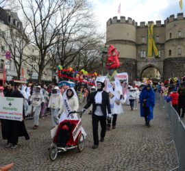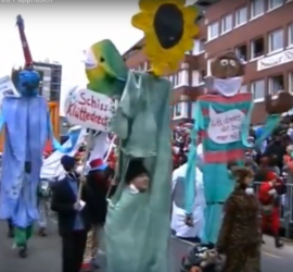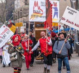 2015: Wir: „Su schäl jeck? Nää, TTIP weg!“ (sie: „Social jeck, kunterbunt vernetzt“) Das Jahr, in dem das Freihandelsabkommen TTIP durchgesetzt werden soll – die Pappnasen haben was dagegen: Jeder Kölner kennt den § 6 des Kölschen Grundgesetzes „Kenne mer nit, bruuche mer nit, fott domet“. Neue Forschungen ergaben nun, dass es einen § 12 gibt, der genauer bestimmt, auf was sich § 6 bezieht. § 12 lautet sehr eingängig: „TTIP in de Tonn!“ Rückschau 2015