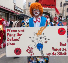 2017: Wir: “Wenn uns Pänz ihr Zokunf sinn: Dat haut se us de Söck“ (sie: “Wenn mer uns Pänz sinn, sin mer vun de Söck“) Was müssen die Pänz auch alles für eine gute Zukunft aus dem Weg räumen: Demokratie-Abbau, Umweltzerstörung, Soziale Spaltung, Kriegstreiben – All dat wulle mer nit, bruuche mer nit, fott domet! Also, Socken wieder anziehen, Ärmel hochkrempeln und für eine gute Zukunft sorgen – und hier in Kölle fangen wir damit an. Rückschau 2017
