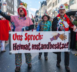 2023: Endlich wieder ein „normaler“ Rosenmontagszug. Aber nur relativ normal, denn er ging verkehrt herum! Und startet sogar von der „Schäl Sick!“. Das machten die Pappnasen allerdings nicht mit und starteten erst auf der „richtigen Rheinseite“. „Ov krüzz oder quer“ war das fantasielose Motto, die Pappnasen erweiterten es kreativ und nach vorne schauend: „Ov krüzz oder quer: Umfairteilen muss her“! Rückschau 2023