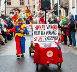 2021: War da nicht was? Corona etwa? Kompletter Karnevalsausfall? Nein, nicht der ganze Karneval fiel aus, die unbeugsamen Pappnasen Rotschwarz legten einen Minizoch auf die Straße und hatten einen (angemeldeten) öffentlichen Auftritt unter dem Motto „Zesamme stonn mer jäje Corona und Kappetalismus“ (offiziell: „Nur zesamme sin mer Fastelovend“). Die Pappansen wissen nämlich um einen Impfstoff, der gegen beides hilft: Solidarität! Rückschau 2021