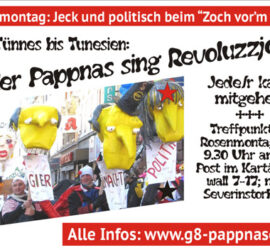 2012: Wir: „Jeder Pappnas sing Revoluzzjohn“ (sie: „Jedem Jeck sing Pappnas“) – Die Pappnasen feiern den weltweiten Aufruhr und Protest (Arabischer Frühling, Occupy, Indignados etc.), durch den die Herrschenden weltweit ins Schwitzen geraten. Rückschau 2012