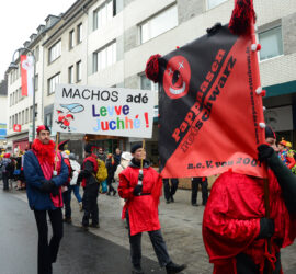 2026: „Machos adé – Leeve Juchhé“ – Mer dun et för Alle! Wieder waren die Heinzelmische beim Zug dabei. Diesmal gegen Patriarchat, Machos, Männergewalt usw. Dabei: Arsch huh, Stadtbildquiz usw.. Rückschau 2026