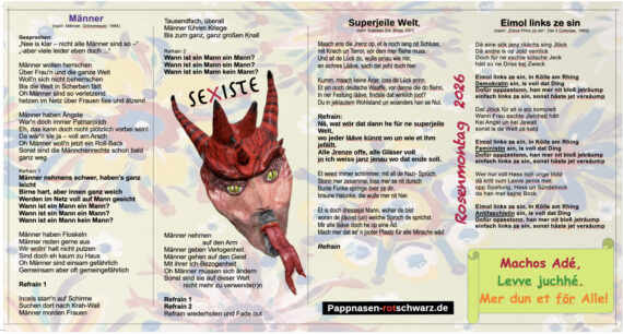 Rosenmontag 2026 Bilder und Videos vom Zug 2026 in Kürze hier! Unser Liedflyer für 2026 auch zum herunterladen Unsere Lieder 2026 Schrei nach Frieden Einmol links zu sin Männer – Pappnasenversion Zeit, das sich was dreht – Bv Linke – Pappnasen